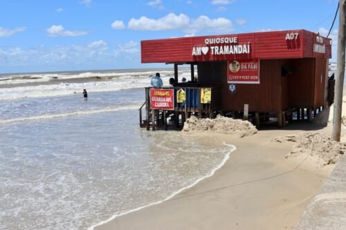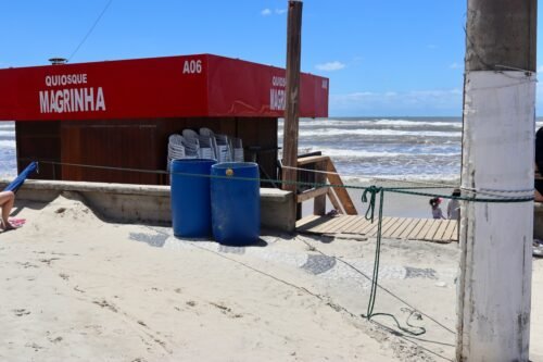 Ao todo, quatro quiosques precisaram de atenção especial e seguem sendo monitorados ao longo do dia, com reposição constante das contenções conforme a ação das ondas.