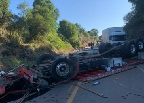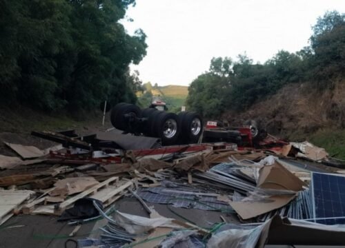 Por volta das 5h50, um caminhão carregado com painéis de energia solar tombou no trecho entre Lagoa Vermelha e Caseiros, resultando na morte do condutor.
