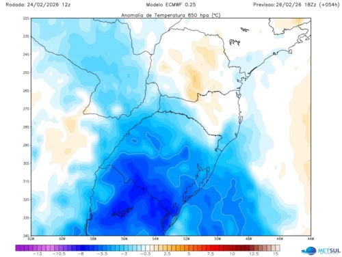 Na primeira metade da próxima semana, com a influência do ar frio já se dissipando, as madrugadas nas áreas de maior altitude do Rio Grande do Sul e de Santa Catarina podem ter mínimas baixas pelo perfil mais seco da atmosfera.
