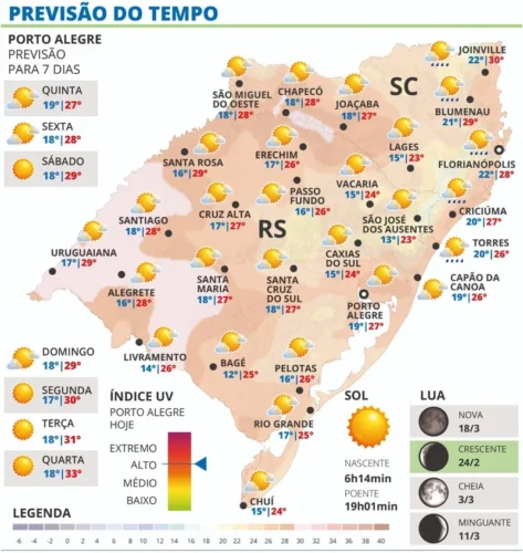 O sol aparece em todas as regiões do estado, embora acompanhado de nuvens em grande parte do território gaúcho.