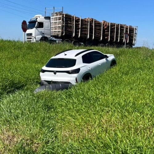 Com o impacto, a condutora do Tera perdeu o controle do veículo, que acabou descendo um barranco às margens da rótula.