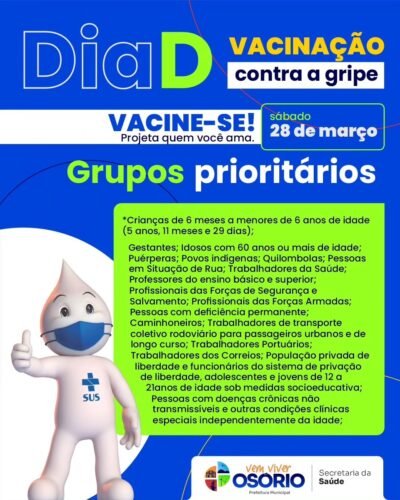 A Prefeitura de Osório, por meio da Secretaria Municipal de Saúde, realiza neste sábado, dia 28 de março, o Dia D de Vacinação contra a gripe (influenza).