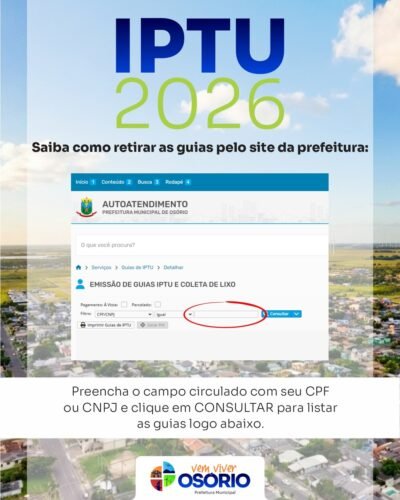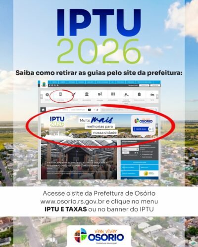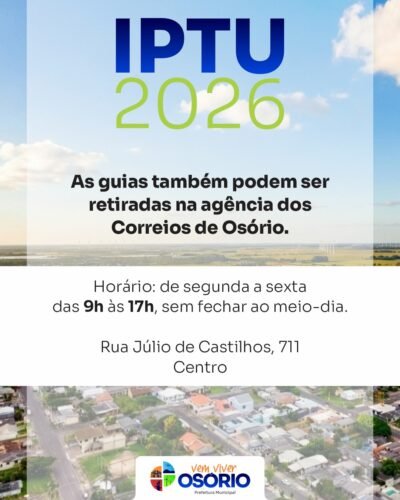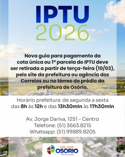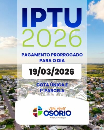 A Administração Municipal de Osório informa que prorrogou o prazo para o pagamento em cota única do Imposto Predial e Territorial Urbano (IPTU), bem como a 1ª parcela, para o dia 19 de março de 2026.