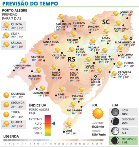 Esta quinta-feira, 12, será mais um dia em que o sol aparece entre nuvens no Rio Grande do Sul, mas com previsão de chuva para algumas regiões do estado.
