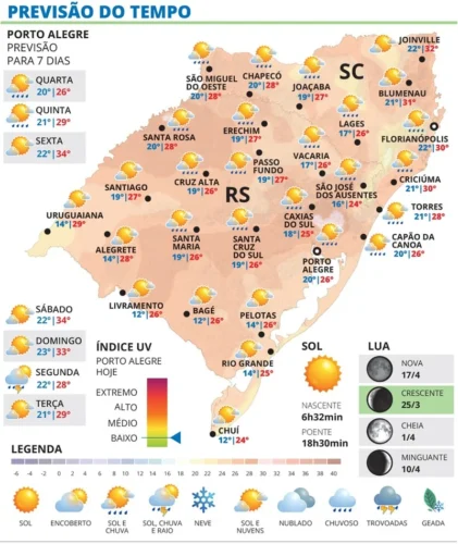 Segundo a MetSul Meteorologia, pode chover moderado a forte em setores numa faixa entre o Noroeste, Médio e Alto Uruguai, Alto Jacuí, Vales, Grande Porto Alegre e o Litoral Norte.