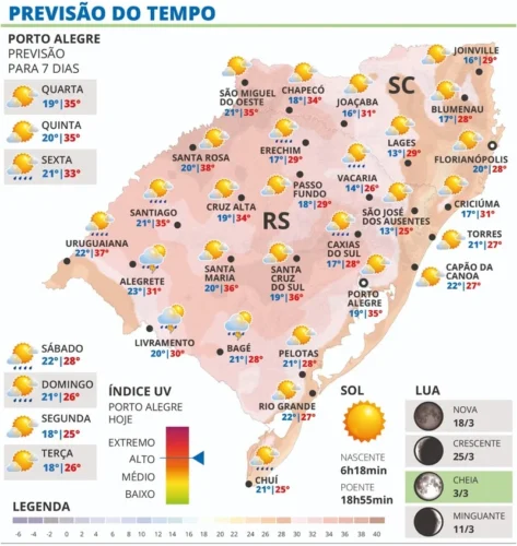 O sol predomina em grande parte do dia e garante o aquecimento com máximas ao redor e acima de 35°C em muitos municípios, inclusive na região metropolitana de Porto Alegre.