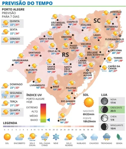 O dia será abafado, com mínimas em torno de 20°C na maior parte do território gaúcho.