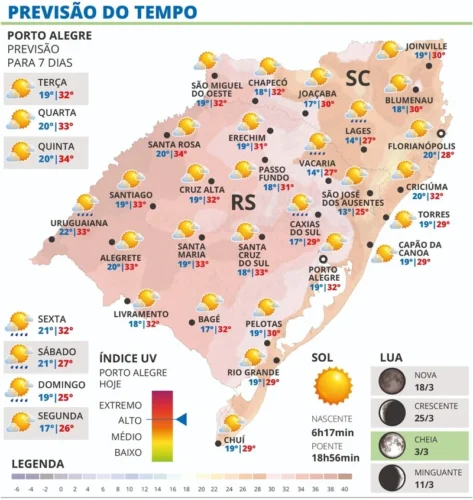 A terça-feira começa com marcas amenas e agradáveis em todo o Rio Grande do Sul, mas, com a presença do sol, aquece rapidamente durante a manhã.
