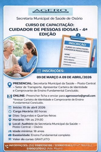 O curso é gratuito, oferecendo uma oportunidade de capacitação e formação para quem deseja atuar no cuidado de pessoas idosas.