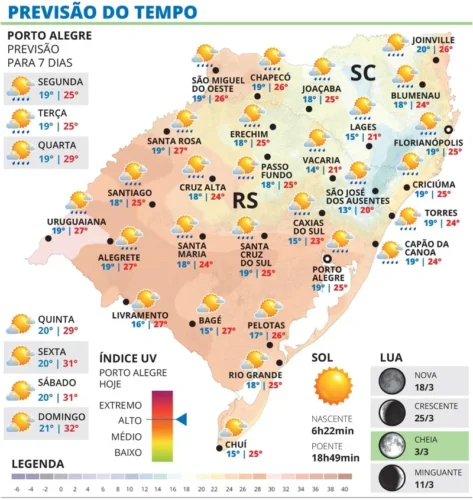 Em Porto Alegre, a máxima prevista é de 25ºC.