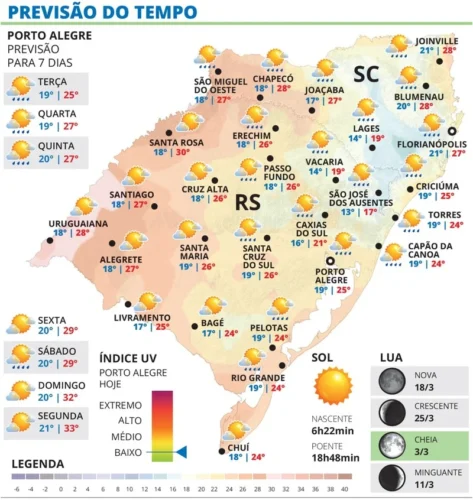 Acompanhando o tempo nublado, a previsão é de chuva ou garoa em diferentes pontos do Norte e do Leste gaúcho, inclusive na capital.