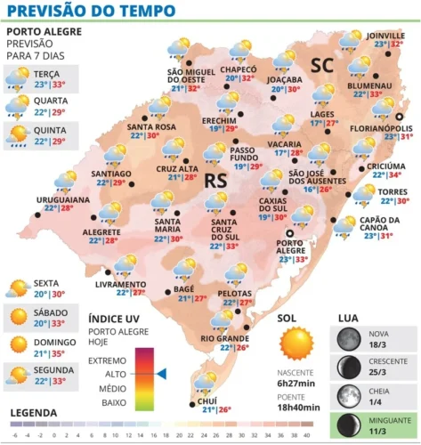 O calor não será tão intenso quanto na segunda-feira na maior parte do território gaúcho, mas seguirá forte em pontos como os vales e a região da Grande Porto Alegre.