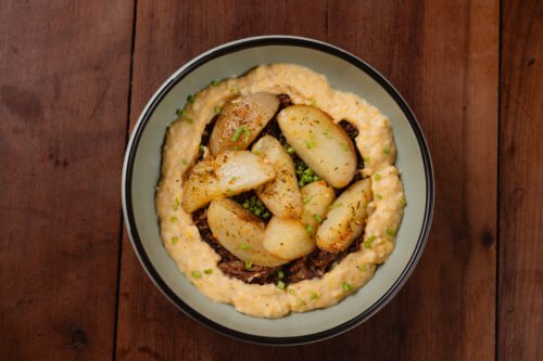 Batata rústica assada com charque e creme de milho. Receita de família.