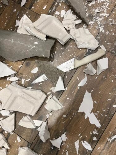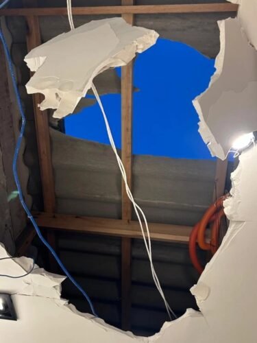 De acordo com os proprietários, o criminoso invadiu o local pelo telhado, causando estragos significativos na área de acesso, incluindo a quebra do forro de gesso.