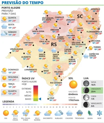 Devido à influência de uma frente fria associada a um ciclone no Atlântico Sul, o tempo fica instável e com chuva em grande parte do Rio Grande do Sul nesta quinta-feira, 23.