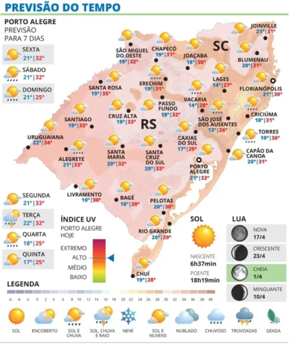 Para quem vai ao evento Família ao Pé da Cruz, na Arena do Grêmio, a previsão é de sol e temperatura que pode chegar aos 32ºC. Recomenda-se o uso de protetor solar e hidratação.