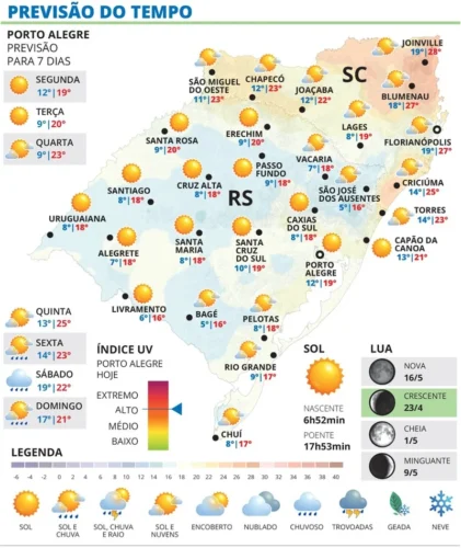 A semana começará no Rio Grande do Sul com tempo ensolarado na maioria das regiões do Estado.