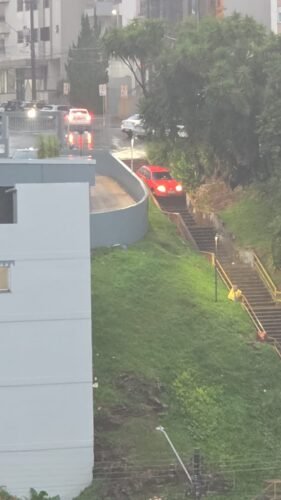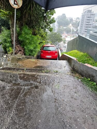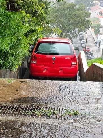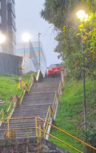 Durante um forte temporal, um motorista idoso acabou avançando com o carro sobre uma escadaria de pedestres na Avenida Salgado Filho.
