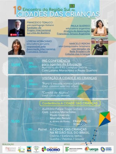 Também estarão presentes nomes de destaque na área, como a educadora peruana Lorena Morachimo, responsável pela Associação Internacional Francesco Tonucci; a educadora argentina Paula Querido, diretora da Associação Francesco Tonucci Argentina; e o ator e pesquisador brasileiro Marcelo Peroni, coordenador da Rede Brasileira de Cidades das Crianças.