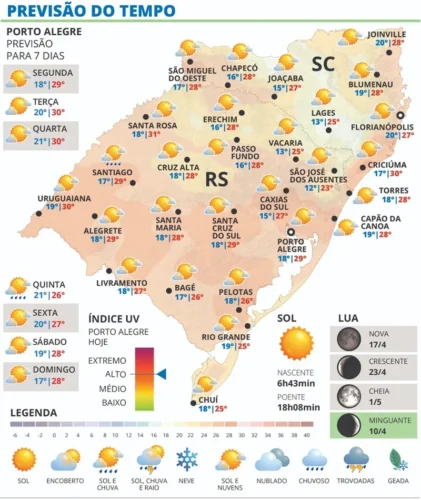 Na Grande Porto Alegre, os termômetros devem marcar 29ºC durante a tarde.