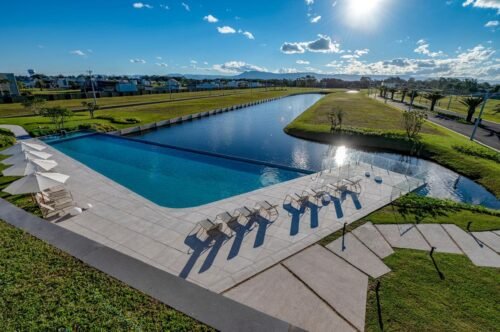 O condomínio conta com 179 lotes, que variam de 300 m² a 390 m², distribuídos em uma área total de 10,5 hectares, além de um lago central com 9.500 m² de espelho d´água, elemento estruturante da paisagem e da experiência dos moradores.