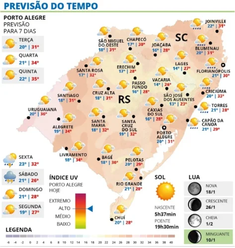 Contudo, após dias de instabilidade e marcas amenas, apesar do abafamento em alguns períodos, os gaúcho terão que lidar com o aumento da temperatura já nesta terça-feira, 13.