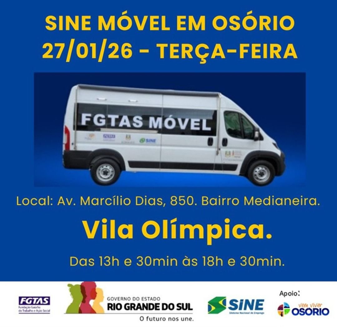 💼🤝A Agência FGTAS/SINE de Osório, em parceria com a Unidade Móvel da FGTAS, realiza nesta terça-feira (27/01), um atendimento especial à comunidade, no Centro Esportivo Professor David Fleck (Vila Olímpica), no horário das 13h30min às 18h30min.