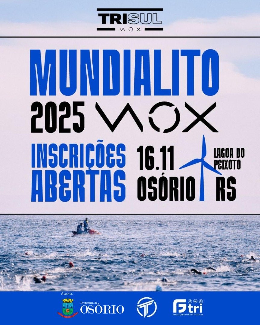 A Trisul WOX e a Federação Gaúcha de Triathlon realizam neste domingo (16/11), o Mundialito WOX 2025 Triathlon de Osório, um dos principais eventos esportivos do calendário nacional de triathlon e águas abertas.