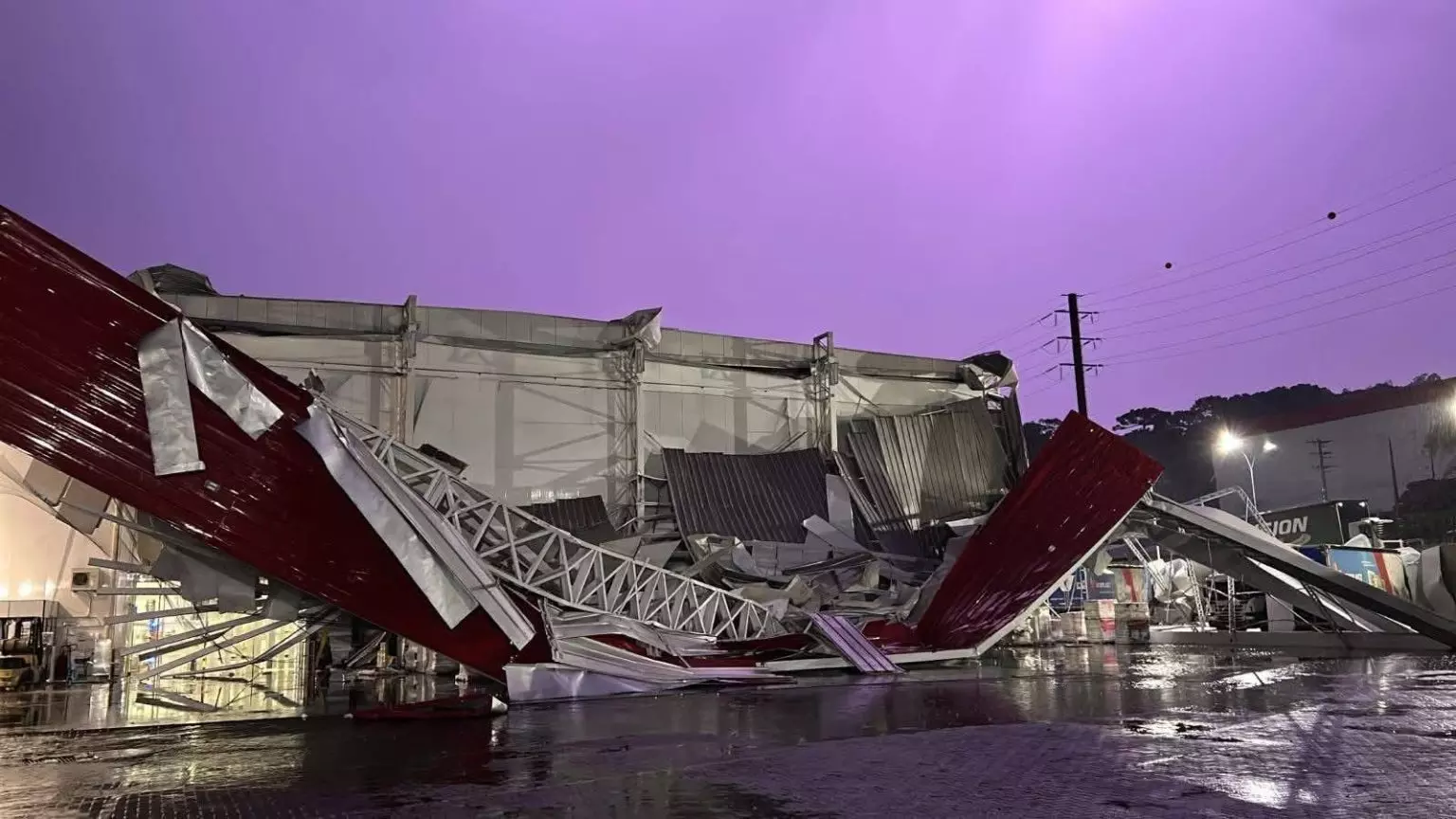 As imagens mostram telhados retorcidos, pilares metálicos no chão e parte da cobertura completamente arrancada, indicando a força do fenômeno.