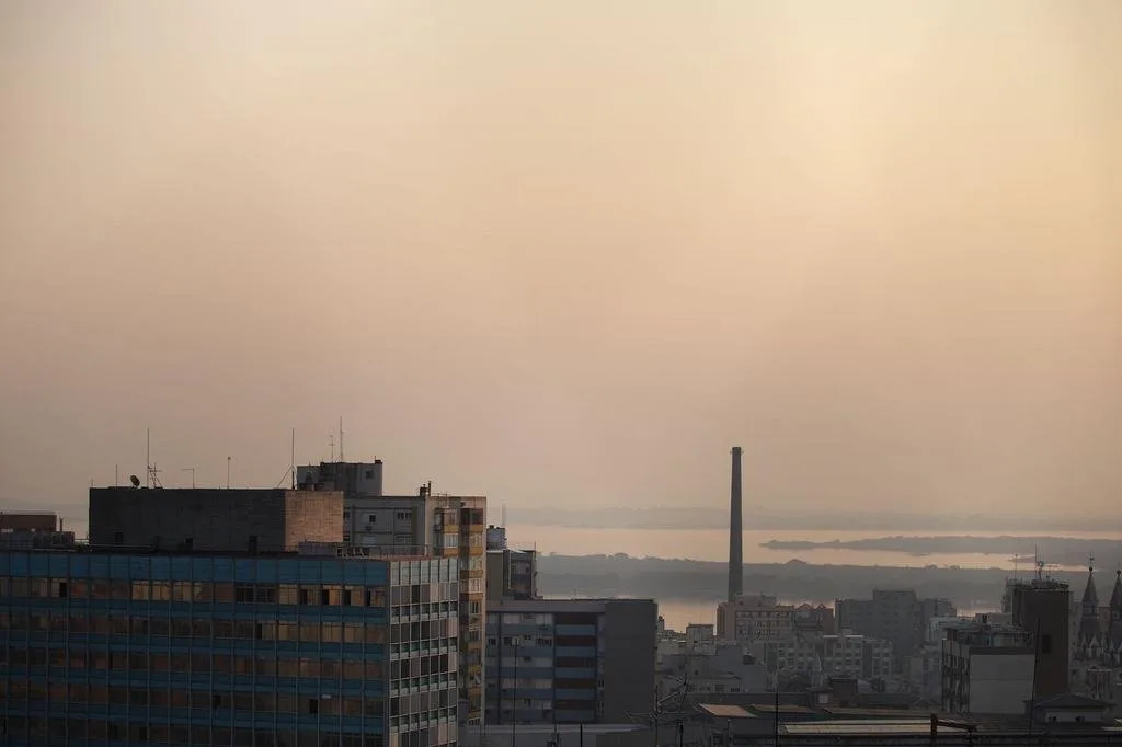 Em Porto Alegre, durante o início da manhã e ao final da tarde, uma densa camada cinza reduziu a visibilidade em um dia de céu aberto.