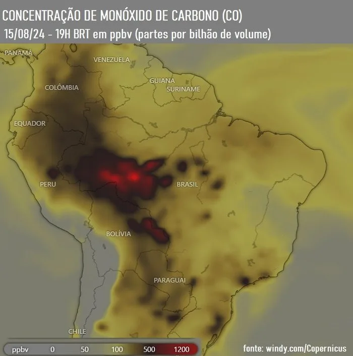 Josélia Pegorim, meteorologista da Climatempo, explica que, quanto mais vermelho (no mapa), maior a concentração de CO, emitido para a atmosfera pela queima petróleo (gasolina, diesel) e pelos incêndios florestais.