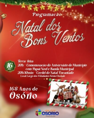 Nesta terça-feira, dia 16 de dezembro, Osório comemora seu aniversário de 168 anos com uma programação recheada de magia e alegria, unindo tradição e espírito natalino.