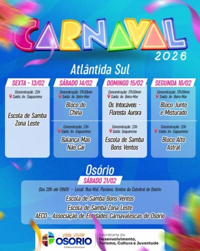 🎭🎉A partir da próxima sexta-feira (13/02), inicia o Carnaval de Atlântida Sul, balneário de Osório. Serão quatro dias de folia com trio elétrico, blocos carnavalescos e escolas de samba percorrendo as principais avenidas da praia nos turnos da tarde e também à noite.