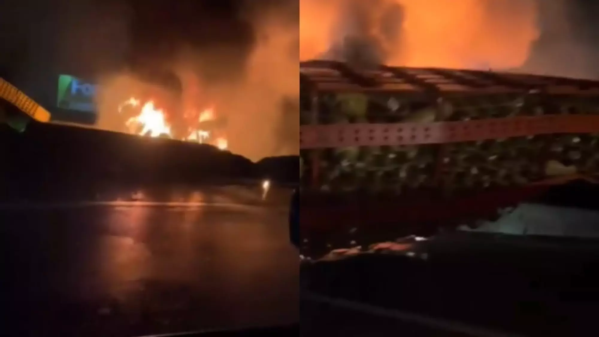Caminhão carregado com botijões de gás tomba, pega fogo e causa bloqueio total na BR-101 em Joinville