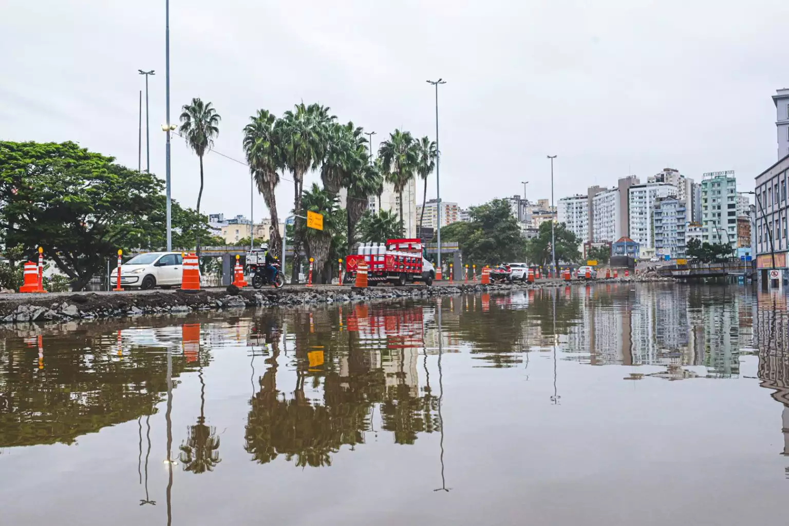 Casa de bombas transborda e água invade avenida Mauá, em Porto Alegre