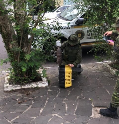 A Patrulha Ambiental (PATRAM) foi acionada para realizar a retirada segura do tatu.