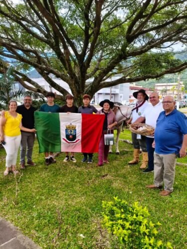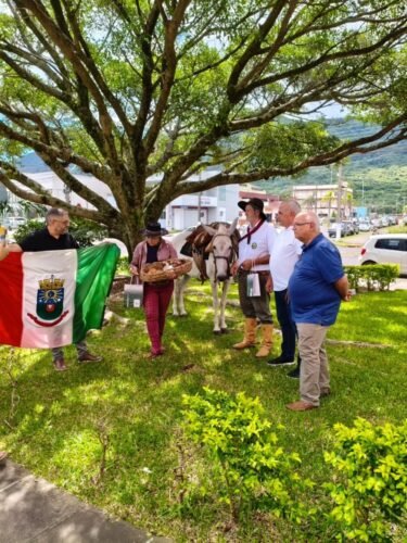 Familiares e amigos também aguardavam a chegada, entre eles os filhos Kainã, Luã e Lucas, estudantes e moradores do município, além do amigo Edson Sana, acompanhado da Mula Chica, figura emblemática ligada aos tropeiros do Litoral Norte Gaúcho, e da amiga Marisa Kingeski.