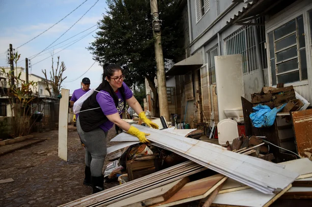 Cerca de 2 mil voluntários passaram pela região, na zona norte de Porto Alegre, para limpar as ruas e 200 residências que foram devastadas pela enchente. O mutirão aliviou um pouco a dor dos moradores, que estão há mais de um mês nessa situação.